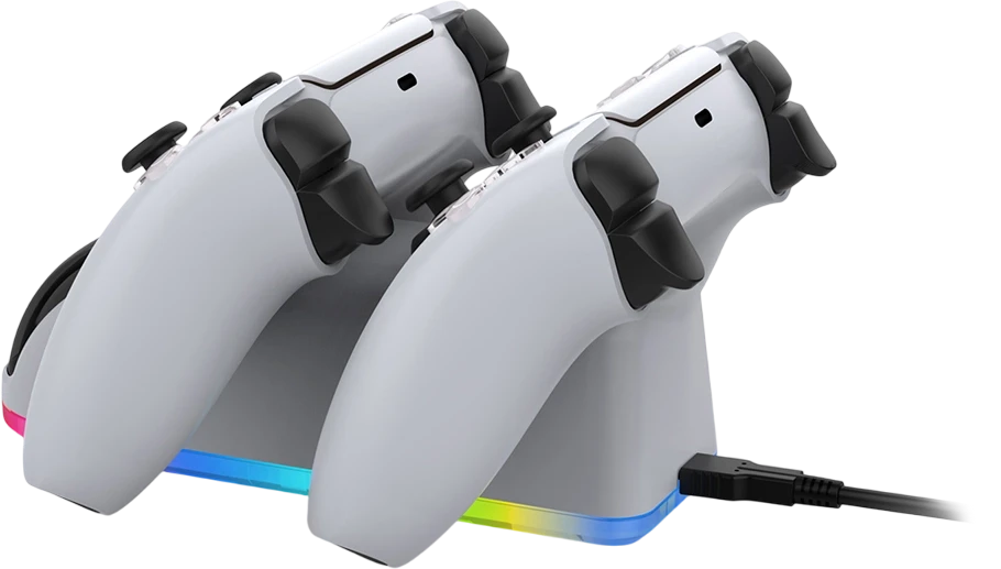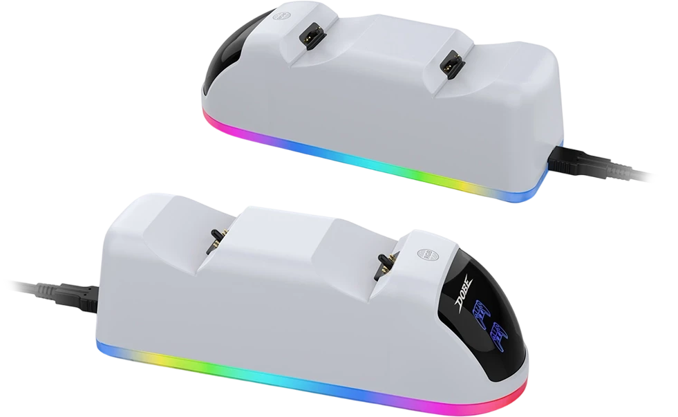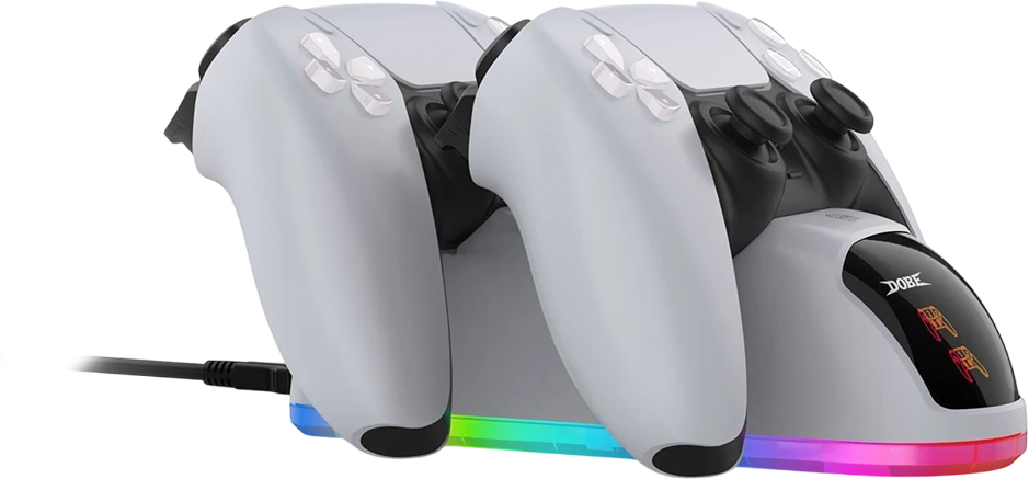 The DOBE Dual Charging Stand TP5-0515S is the ultimate solution for charging your PS5 DualSense controllers. Designed with efficiency and convenience in mind, this stand simultaneously charges two controllers with precision. Its compact, stylish design blends seamlessly into any gaming setup. The LED charging indicators allow you to monitor the charging status effortlessly, while the overcharge protection ensures safety and extends your controller's lifespan. Powered directly via USB after connecting the stand to power. Keep your gaming area organized and your controllers ready for action with this essential accessory. Perfect for all PS5 gamers who value reliability and style!